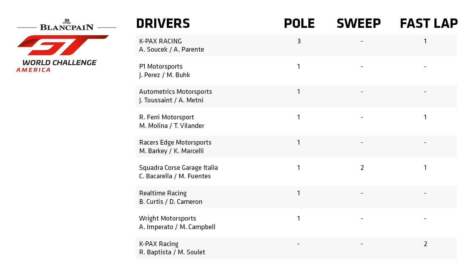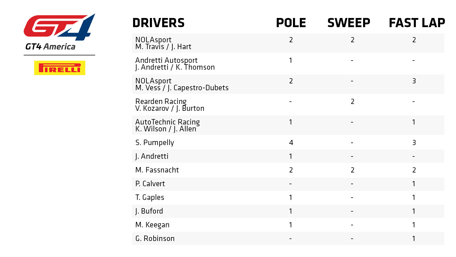 Moving to the opposite coast, Sprint GT4 Pro driver Spencer Pumpelly, already on the board with his St. Petersburg pole position capture, completed the Long Beach dual challenge of achieving top Qualifier and setting the fast lap to acquire the Fastest SHYFTER award at the temporary street circuit in Southern California; the single-race weekend didn't allow for a double-header sweep.