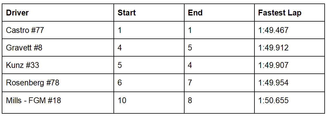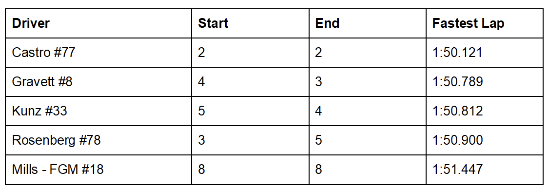 The early stages were a bit of shuffling as Castro reclaimed P2 by lap four and Rosenberg fought back to position after early pressure from an Acura competitor. After the opening laps, the field settled
